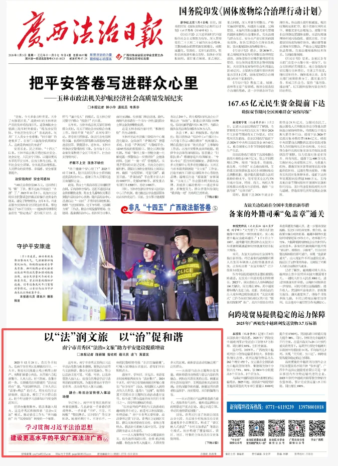青秀区南阳镇施厚村在古岳文化艺术村设置“三官一员”法律服务站,通过“法律明白人”调解纠纷、保障游客和经营主体合法权益,为景区营造了良好的环境,直接助力景区年接待游客超10万人次、经济收入增长20%,证明法治是吸引游客、留住游客的“隐形名片”。