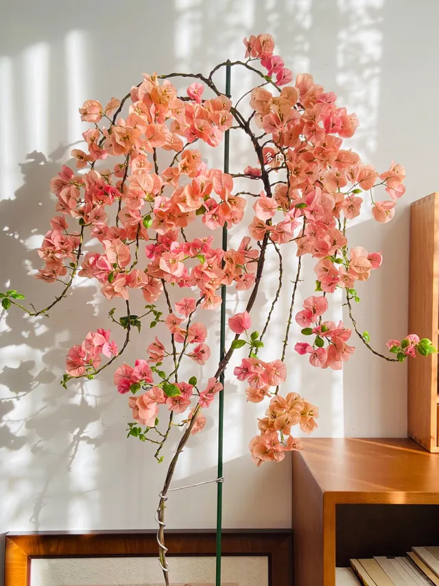 花友@多肉爱种花就养了一株叫罗莎”的三角梅,被她打理成了苗条的“柳风”造型,花色十分漂亮,从粉红慢慢变淡粉、肉粉,最后带点鹅黄,一棵树上就出来几个颜色,真是百花齐放。