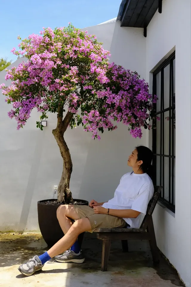 而让人惊讶的还在后面,大家以为这得是种了一大片花才能做成的,一近看那花树不是什么地栽花,就只是一盆三角梅,只有一棵而已!