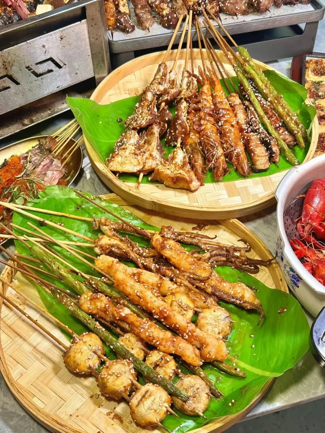 摊前的烟火气更是让人沉醉。老板手持烤刷不停翻烤,酱汁滴落炭火瞬间迸发出火星,伴随着“滋滋”的悦耳声响。周围是食客的谈笑声、摊主的吆喝声,昏黄的灯光映着每个人满足的笑脸,晚风里混着烤肉香、果酱香和夜市的热闹气息,这才是柳州夜生活该有的样子。