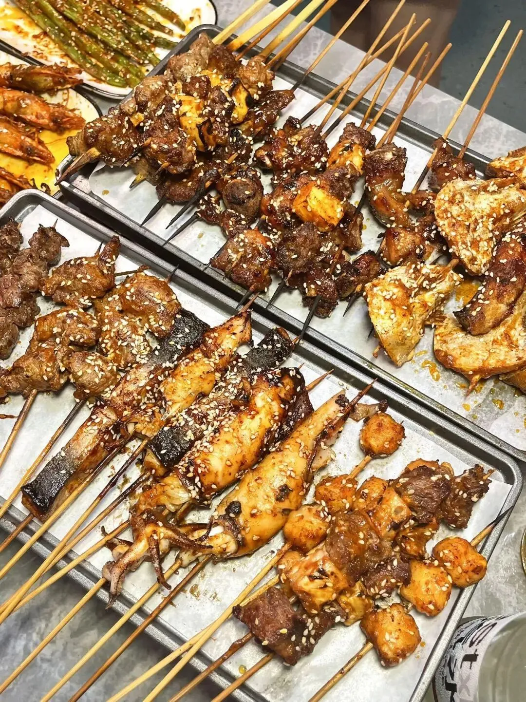 素串里的烤豆腐皮堪称“吸汁王者”。薄透的豆腐皮烤到表面起泡,孔隙里吸满了浓稠的酱汁,软嫩却不失嚼劲。入口先是酱汁的酸甜鲜辣,接着是豆腐皮的豆香,味道浓郁到让人闭眼回味,比肉串还要上头,妥妥的素菜黑马。