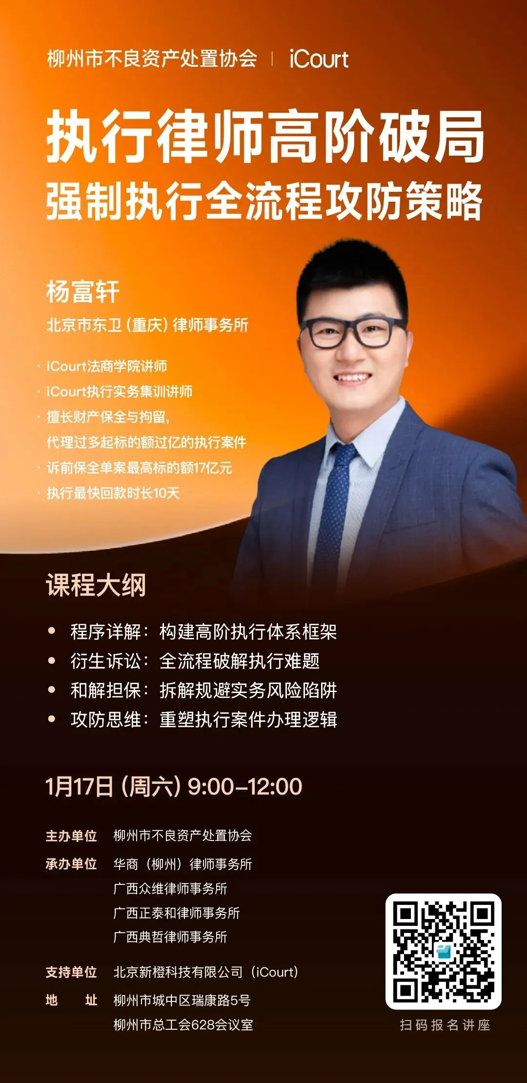 1 月 17 日,为了帮助广大律师深入剖析执行业务的核心,全方位构建高阶执行体系框架,主办单位柳州市不良资产处置协会,将联合承办单位华商(柳州)律师事务所、广西众维律师事务所、广西正泰和律师事务所和广西典哲律师事务所,与支持单位 iCourt 共同举办专题讲座《执行律师高阶破局:强制执行全流程攻防策略》,解锁执行领域的关键密码!