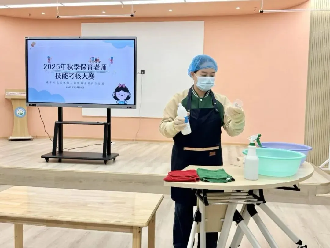 本次考核考核以保育工作精细化、科学化为导向,除幼儿生活照料规范、安全健康防护知识等内容外,重点纳入消毒水配比计算与实操应用相关题目,检验保育老师对卫生消毒流程、配比标准的掌握程度。