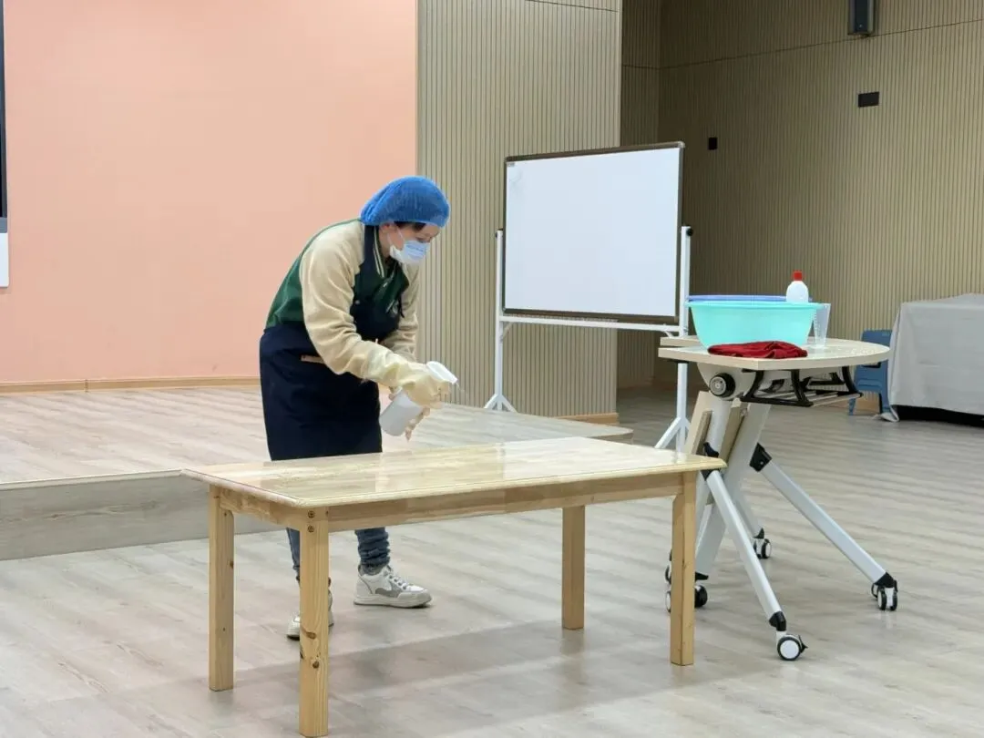消毒液的配比、桌面清洁、桌面消毒,边操作边描述操作要领,保证卫生消毒工作精细化、程序化、规范化,按流程完成每项消毒工作。