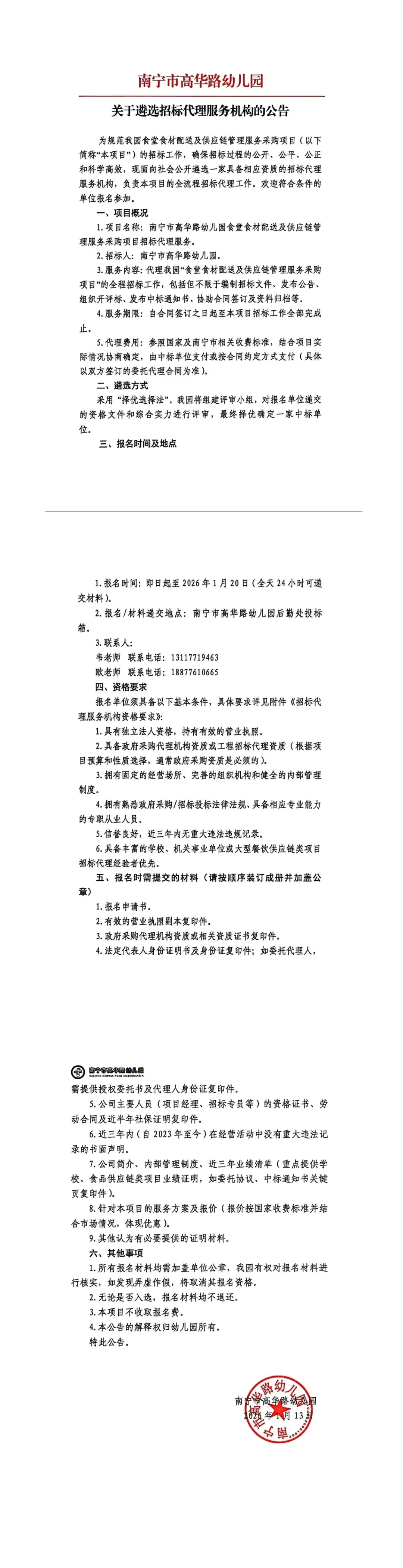 南宁市高华路幼儿园食堂食材配送供应链管理服务采购项目招标代理服务报名表.docx