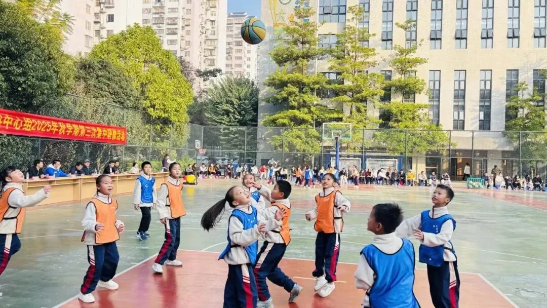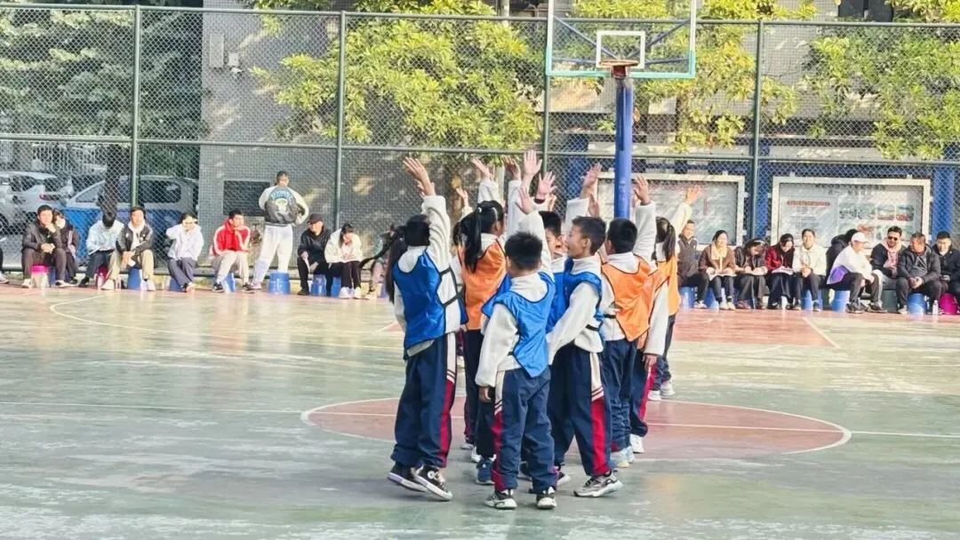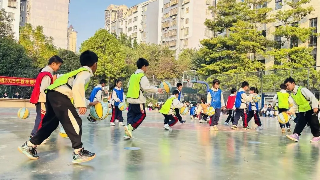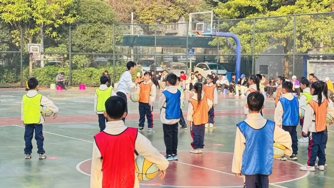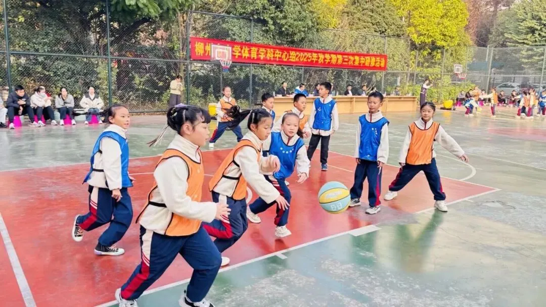 活动伊始,柳州市南环小学的陈虹宇老师带来三年级上册《行进间运球+传接球组合游戏》课例展示。课堂以“篮球体验官”为主题,从课堂常规、动感热身入手,通过自主学练、游戏挑战(翻盘游戏、S形运球大挑战、运球接力大比拼)、小组组合练习到5V5对抗赛等环节,层层递进地引导学生掌握行进间运球动作,突破“行进间运球+传接球组合运用”的难点。