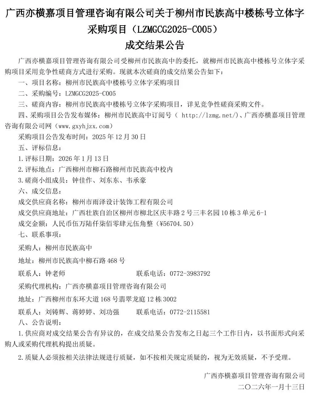 柳州市民族高中楼栋号立体字采购项目竞争性磋商采购成交公告