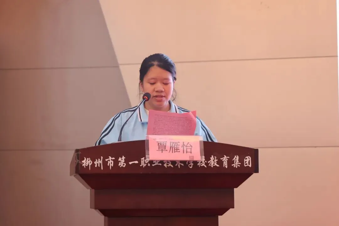 我校学生会负责人覃雁怡在第一次全体会议上向大会作《柳州市第一职业技术学校第二十二届学生会工作报告》。