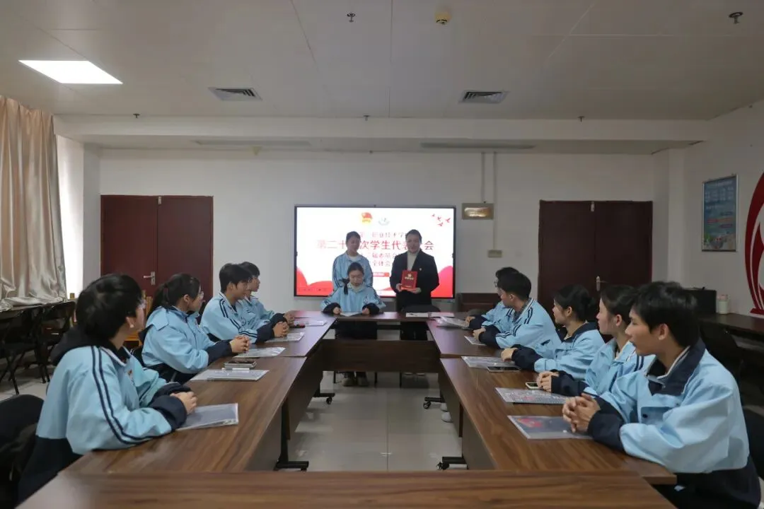 学校团委书记蔡丽在仪式上致辞。她回顾了自第二十二次学代会以来,学生会在思想引领、权益维护、校园文化建设等方面取得的显著成绩,同时传达了全国学联会议精神,强调学联学生会应加强政治学习、推进改革创新,更好发挥桥梁纽带作用,团结引领青年服务国家发展大局。她表示,新一届学生会将务实进取,团结带领广大同学为学校建设国家一流中等职业技术学校的目标贡献青春力量。