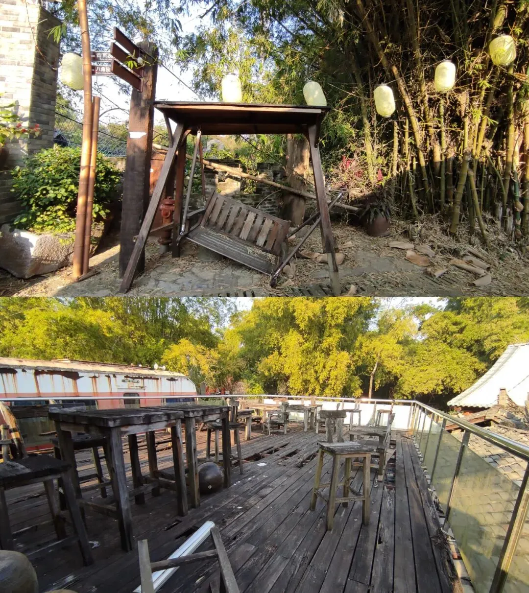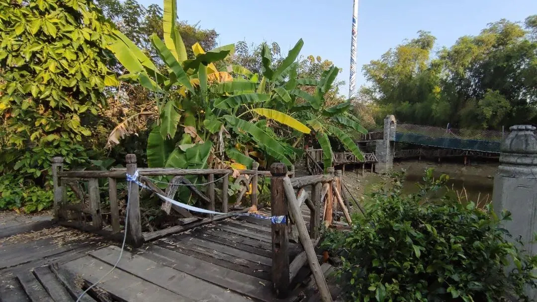 因为缺乏维护,景区的凳子塌了,木制的围栏长期失修腐坏,地上满是落叶。