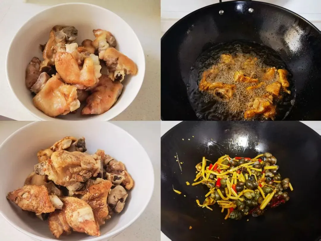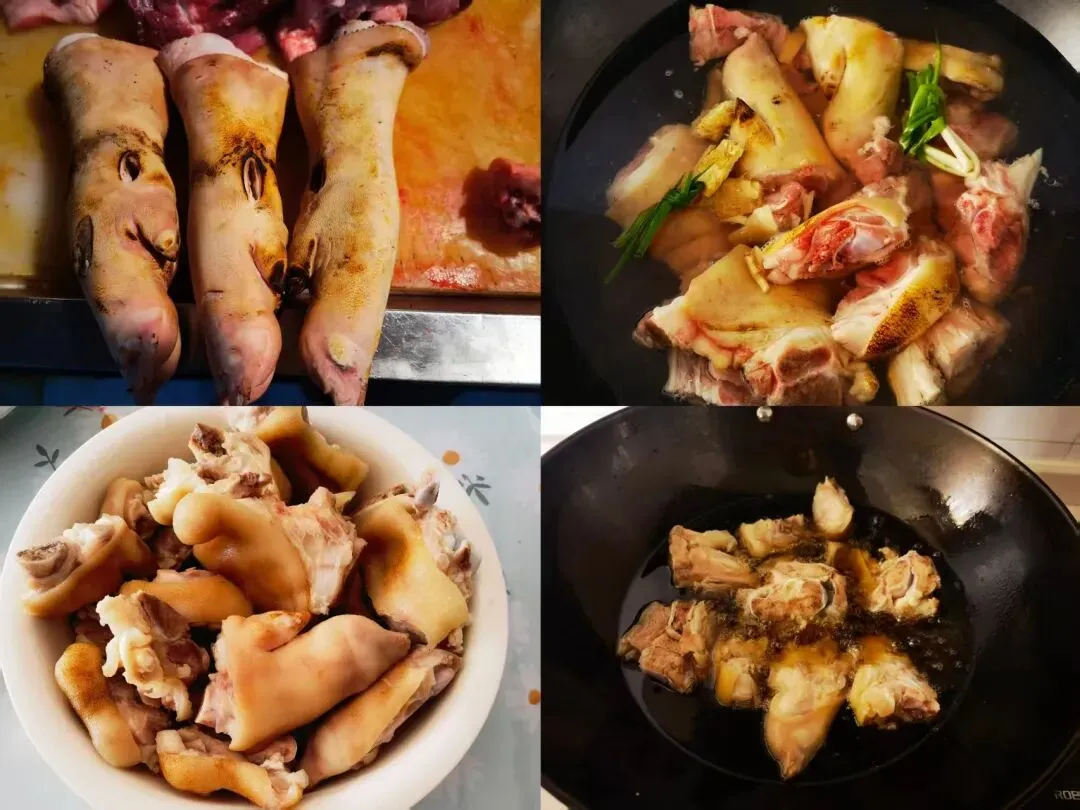 制作过程。将猪手表面水分彻底风干(防止炸时溅油),冷油下锅、猪皮朝下,中小火将油温升高初炸至表皮微黄收缩,升高油温至230°C复炸一次,炸至完全起虎皮,迅速捞出放入冷水中浸泡数小时,形成蜂窝状“虎皮”结构。另起锅炒香葱姜蒜、八角、桂皮、草果、泡椒炒香加入石螺、酸笋等辅料,放入豆腐乳、生抽、白酒提味。