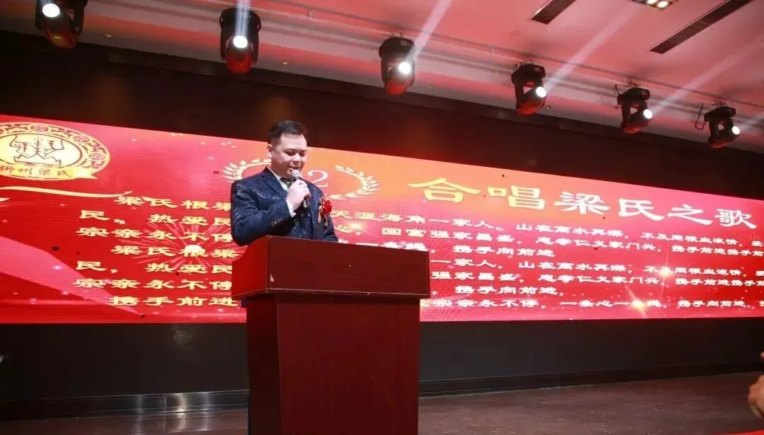 广西梁氏总会梁森会长致辞,五年来,广西柳州市梁氏宗亲会在梁泽礼会长的带领下,促进家族团结、推动家族发展方面取得了显著成绩。我们深知,这些成绩的取得离不开广大宗亲的信任支持与帮助,也离不开宗亲会领导和工作人员的辛勤付出。在此,我代表广西梁氏宗亲总会表示热烈的祝贺!同时也希望柳州梁氏宗亲会在开展梁氏文化事业上继续努力奋斗,发扬光大在今后的日子里戒骄戒躁,团结一致、奋力前行、勇往直前争创更大的辉煌。