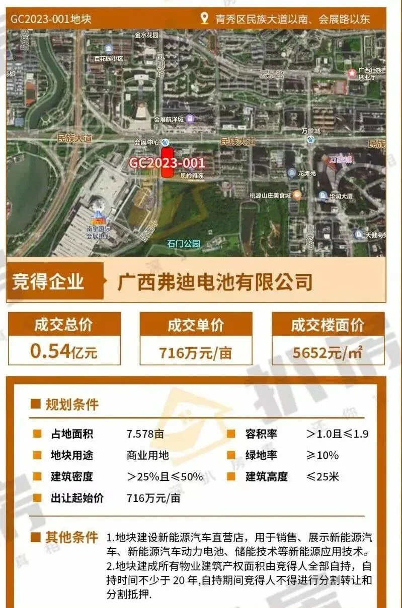 2023年2月,广西弗迪电池有限公司以5652元/㎡楼面价拿下东盟商务区7.578亩地块,成交总价0.54亿元;