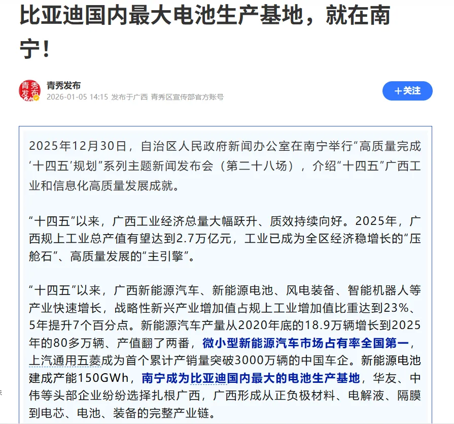 日前,南宁官宣“比亚迪国内最大电池生产基地,就在南宁”。