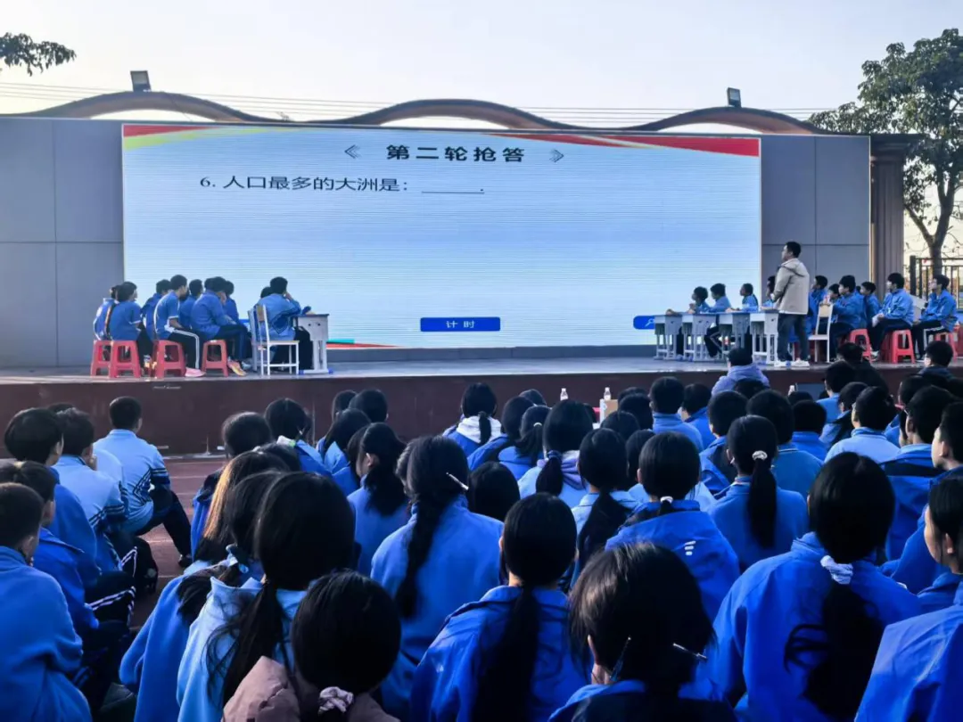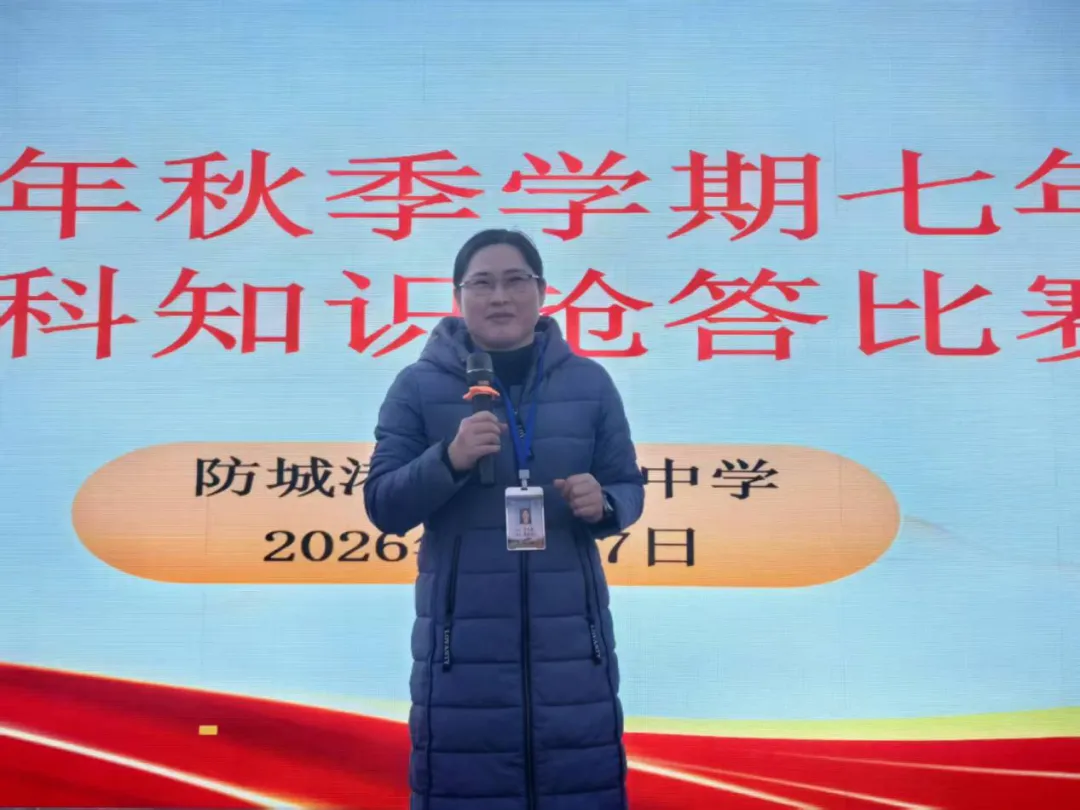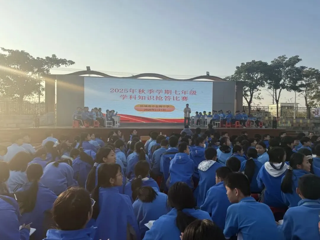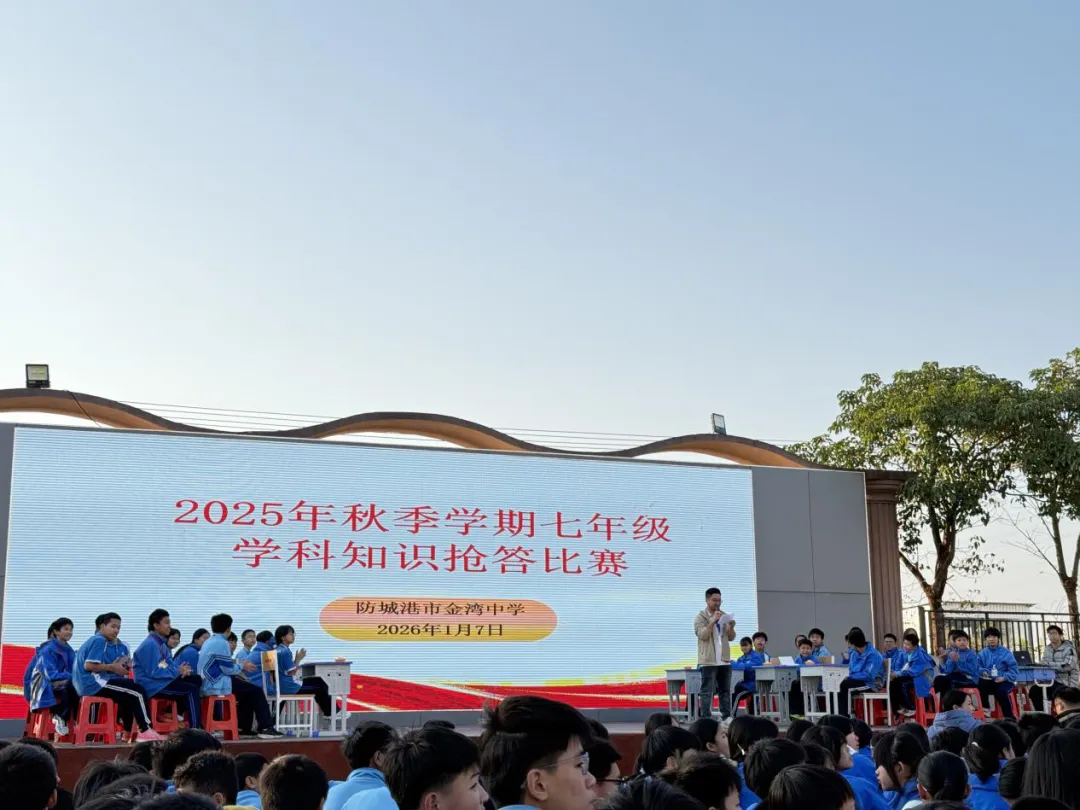 点燃知识火花,绽放青春光芒!为贯彻落实素质教育理念,激发七年级学生的学习热情,拓宽学生知识视野,培养团队协作精神、快速反应能力及竞争意识,同时营造好学、乐学、积极向上的校园文化氛围,2026年1月7日,防城港市金湾中学特在学校足球场举办了以“智慧碰撞,风采飞扬”为主题的七年级学科知识抢答比赛。
