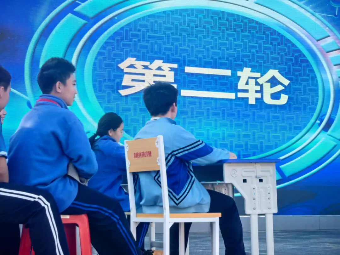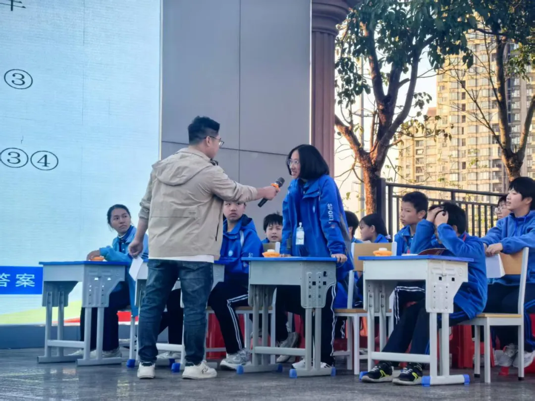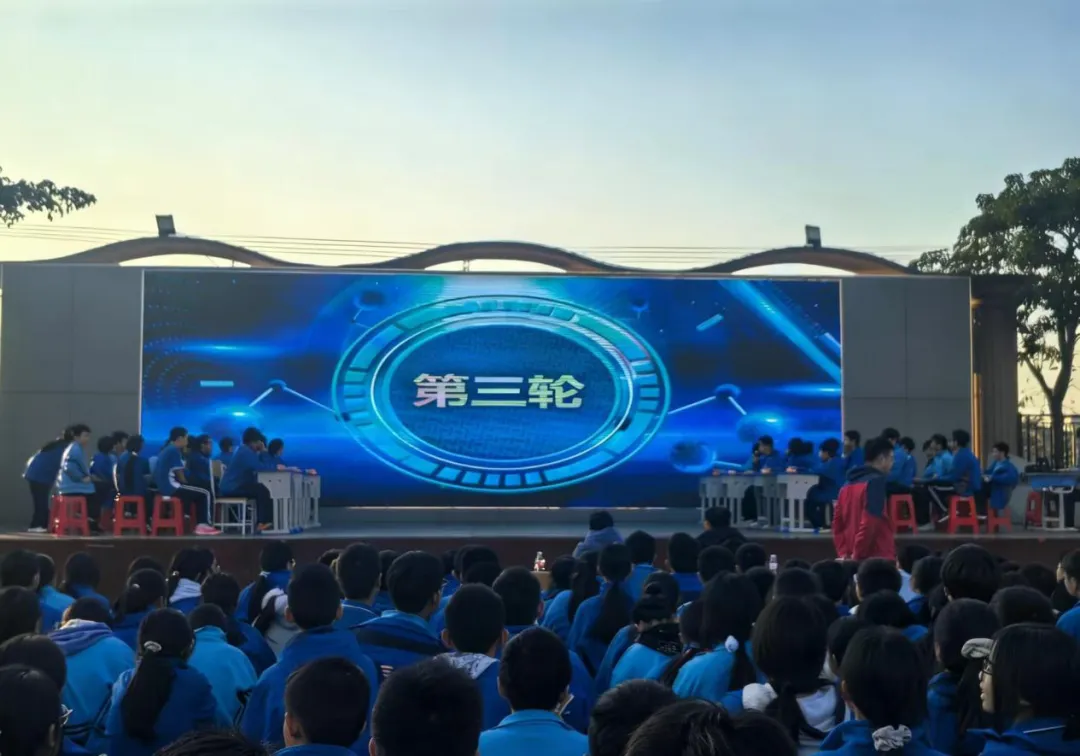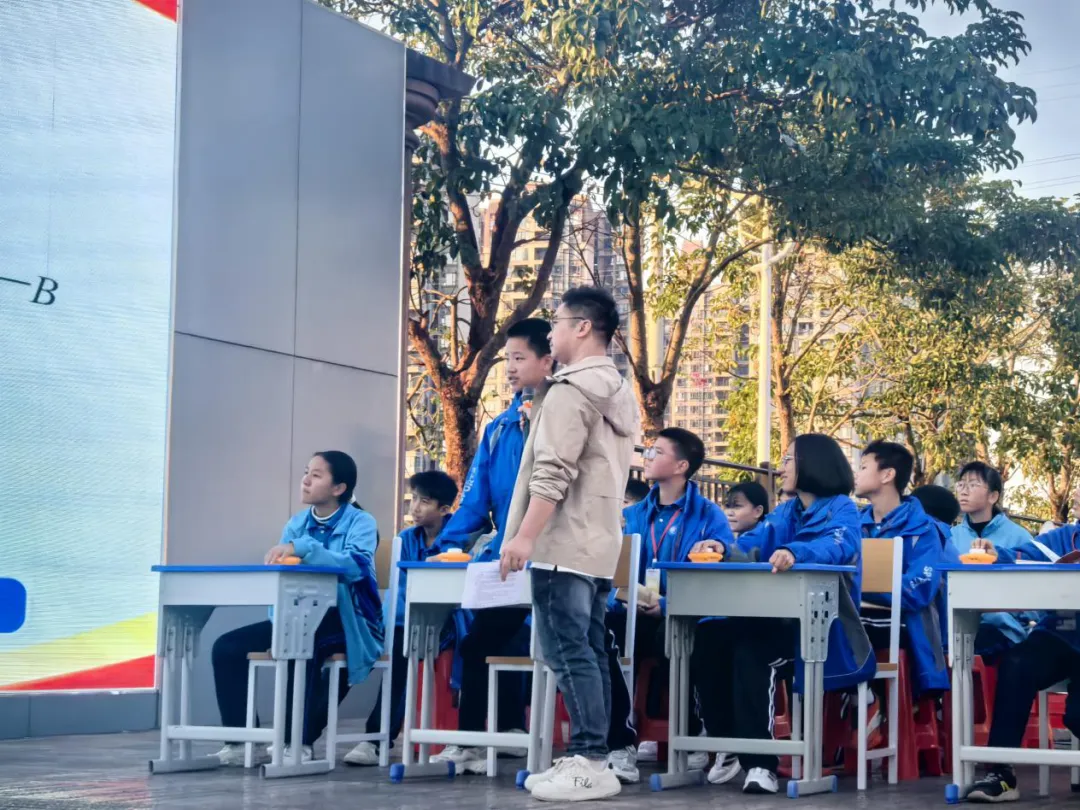 “3、2、1,开始!”每次等待抢答器发出指令的关键时刻,选手们屏息凝神,手指悬于按键之上。要有最快的反应、最稳的心态,才能赢得答题权!从语文诗词飞花的浪漫,到数学巧思妙解的严谨;从英语妙语连珠的流畅,到史地纵横捭阖的广博;更有道法思辨之光的洞见与生物奥秘之门的奇趣,赛场堪称学科万象的缩影。备课组的题目设计充满巧思,内容涵盖各科,充分考验着同学们的知识广度与应变能力,选手们调动全科知识库,展现跨学科思维的力量。同时,班级的同学化身‘智囊团’,在援助环节,观众抢答同样激烈,知识热潮席卷全场!整个足球场,已然成为一个巨大的、共振着的知识能量场。