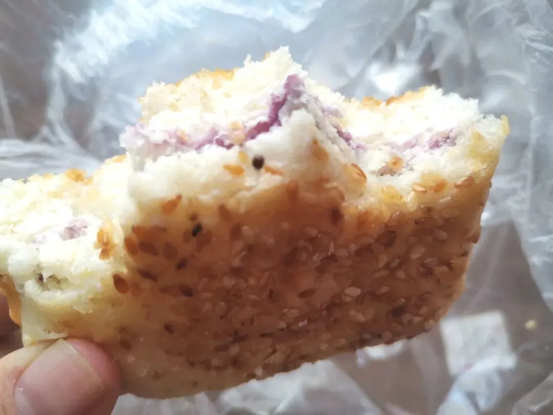 看上去颜值挺不错的,中间还包了一层馅,老板叫我品尝,我就试了一小块。