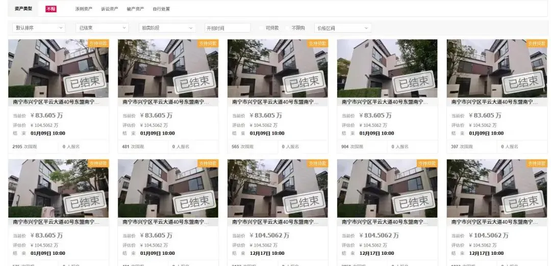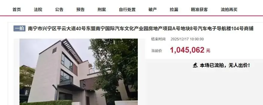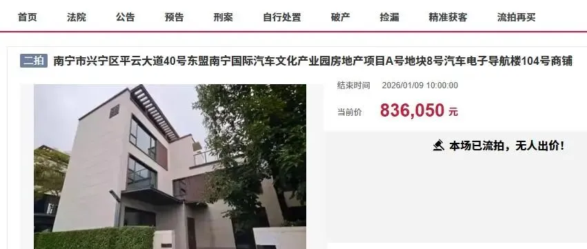 实际上,此次南宁市这个东盟南宁国际汽车文化产业园房地产项目一共是有7栋一模一样的别墅同时进行了第二次拍卖,每栋商业别墅的起拍价都是83.605万元,最终均没有人报名竞拍而流拍。