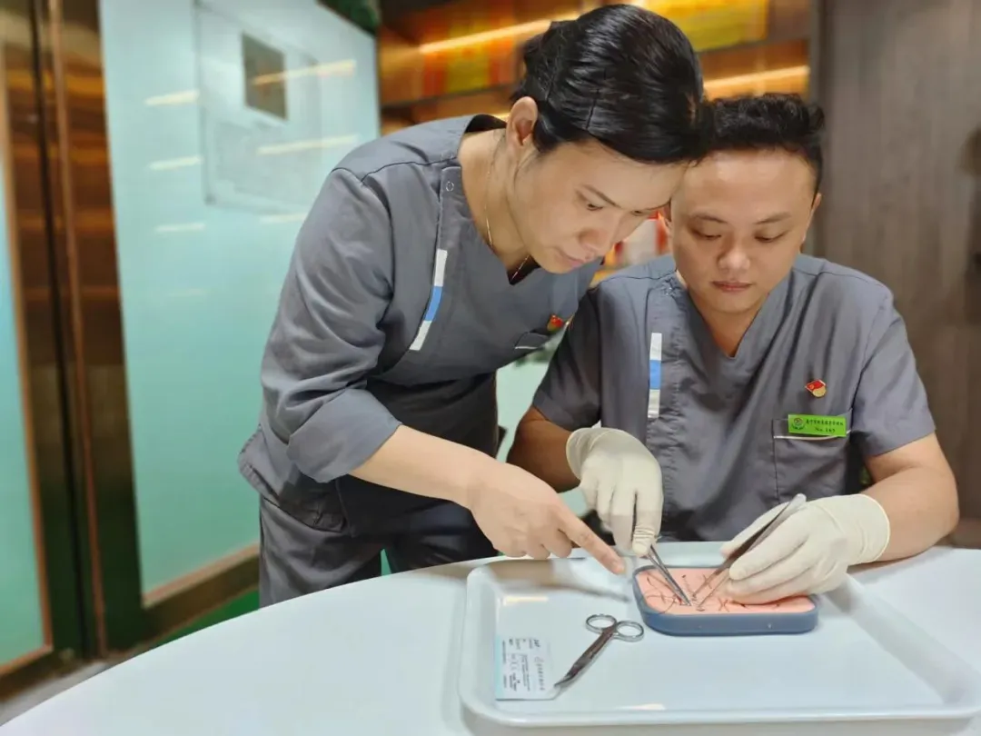 ▲赵际振(右)和黄勤妹一起练习缝合技术。受访者供图
