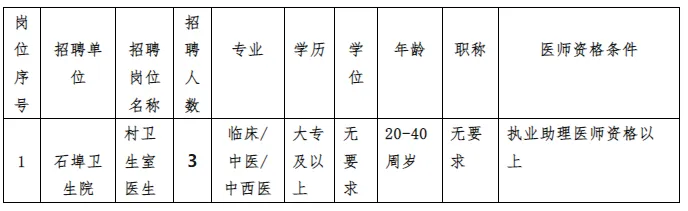 按照乡聘村用原则,根据石埠辖区村卫生室业务发展需求,现向社会公开招聘以下岗位人员,具体招聘事宜如下: