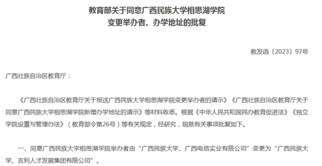2020年6月,吉利控股集团与广西区政府签署战略合作协议,共同推动相思湖学院转设成为独立设置的非营利性民办普通本科学校,拟更名为南宁数字科技学院(筹)。2023年10月,教育部同意广西民族大学相思湖学院的举办者变更为“广西民族大学、吉利人才发展集团有限公司”。