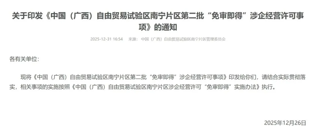 为充分释放承诺审批和信用管理改革效能,让更多市场主体便捷享受“免审即得”“准入即准营”的红利,近日,中国(广西)自由贸易试验区南宁片区管委会印发《自贸试验区南宁片区第二批“免审即得”涉企经营许可事项清单》。在首批30项“免审即得”事项基础上,新增10项涉企经营许可事项纳入“免审即得”范围,进一步拓展改革覆盖广度,持续优化片区营商环境。