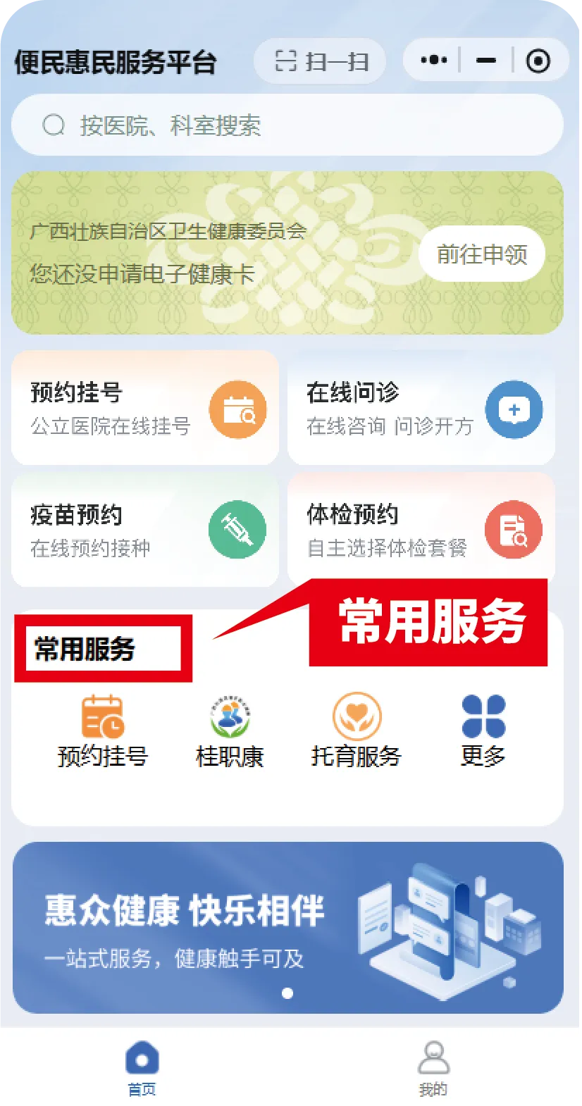在“桂健康”小程序首页中找到“常用服务”,点击“更多”打开常用服务列表页。