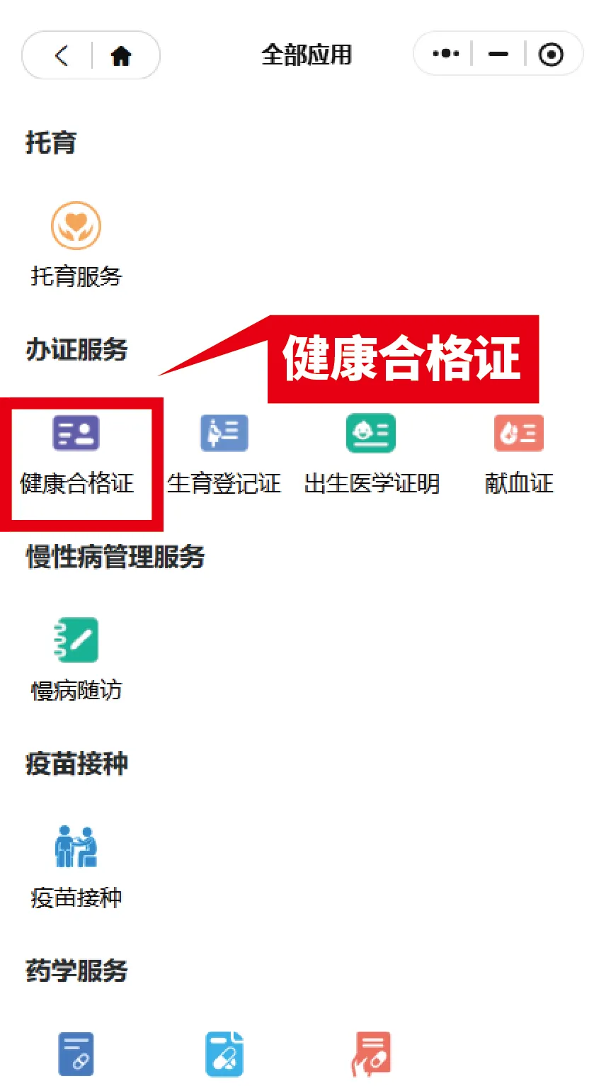 在常用服务列表页面中找到“办证服务",点击“健康合格证”,打开健康合格证明管理页面。