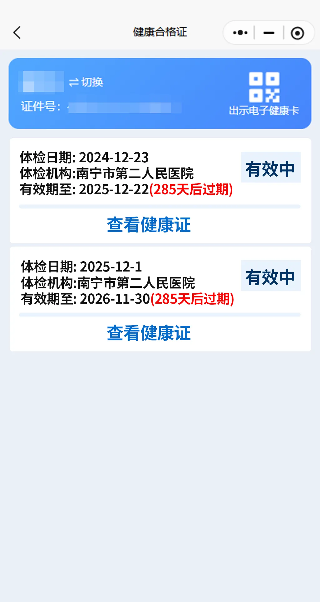 在健康合格证明管理页面可以看到个人拥有的合格证明,点击“查看健康证”,进入人脸识别认证页面。
