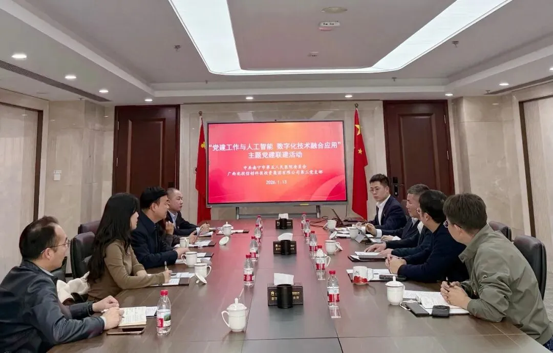 在2026年全国卫生健康工作会议中,国家卫生健康委党组书记、主任雷海潮提出要“大力发展卫生健康新质生产力,推进数智赋能”。1月13日下午,南宁市第五人民医院党委书记方晖带队赴广西北投信创科技投资集团有限公司,开展“党建工作与人工智能数字化技术融合应用”主题党建联建活动。