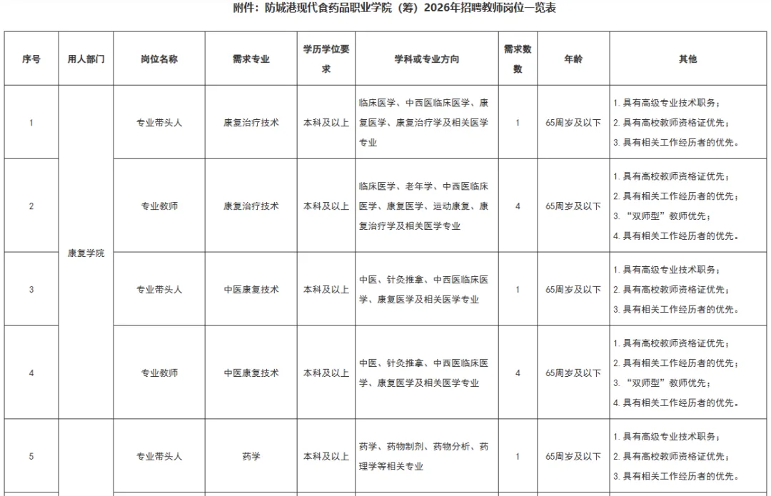 防城港现代食药品职业学院(筹)2026年招聘公告