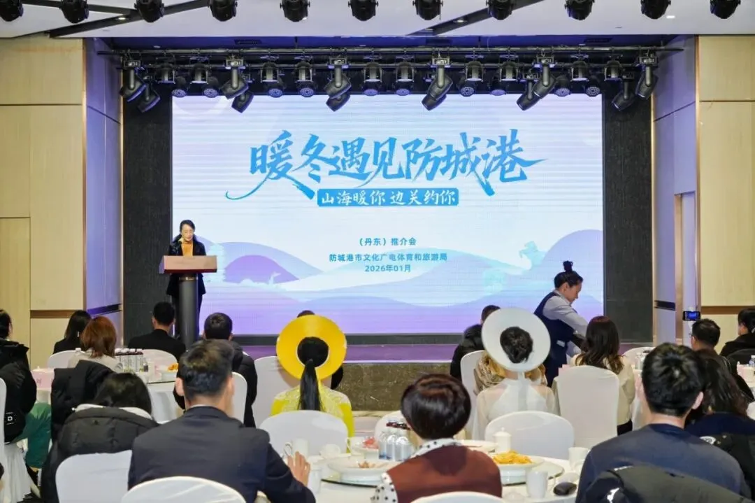 1月14日,“暖冬遇见防城港”之山海暖你·边关约你丹东推介会圆满举办。防城港市文化广电体育和旅游局党组成员、局长冯慧,丹东市文化旅游和广播电视局党组成员、副局长姜连坤出席活动并致辞,来自丹东和防城港的文旅行政部门、旅游企业、研学旅行机构、房产企业、新闻媒体等50多位代表参加交流活动,搭建起南北两座城市文旅互动、产业合作、资源共享的坚实桥梁,为两地冬季旅游市场注入新活力。