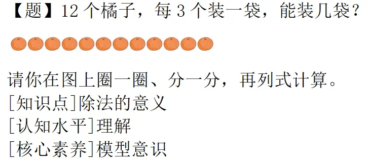 1.能结合“12个橘子,每3个装一袋”的情境,通过圈画、列式等方式表示平均分的过程与结果,并说明算式12 ÷ 3 = 4(袋) 的含义。