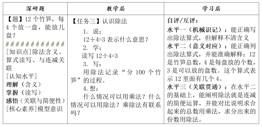 3.能初步判断简单情境能否用除法表示,并能尝试用除法算式进行解释或描述,发展模型意识。