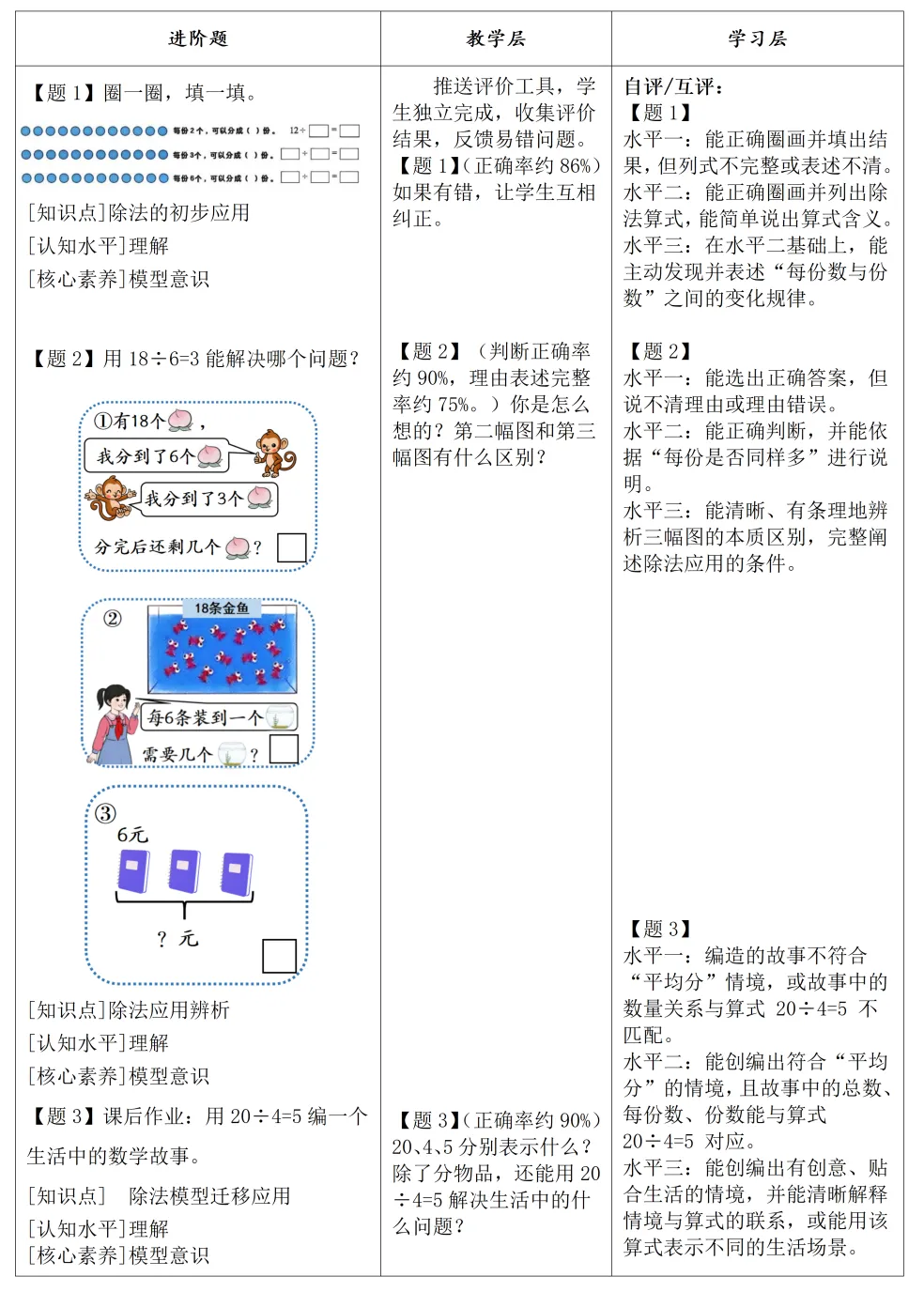 分析:学生对“等分”情境较陌生,操作和表达存在困难,易与“包含分”混淆。