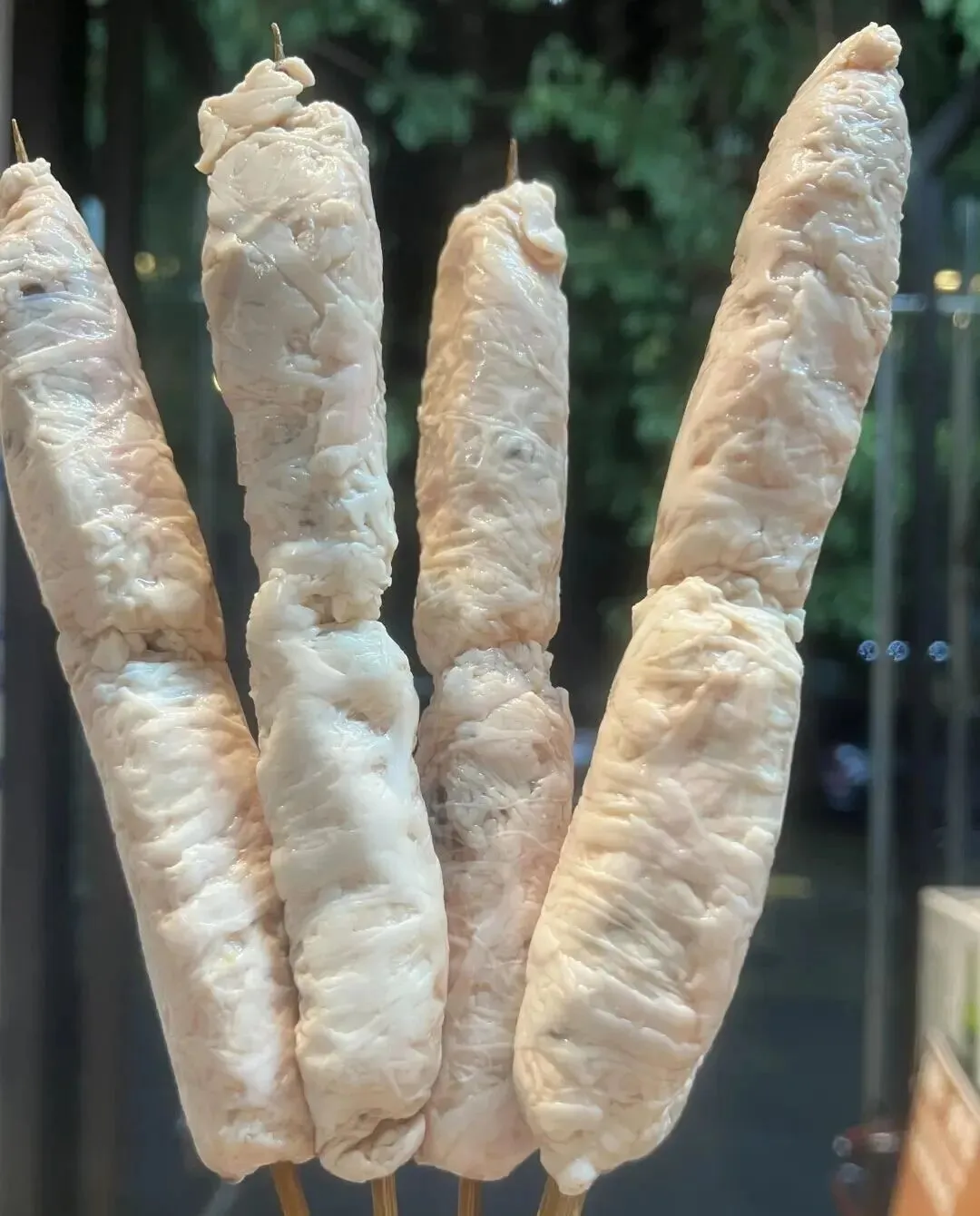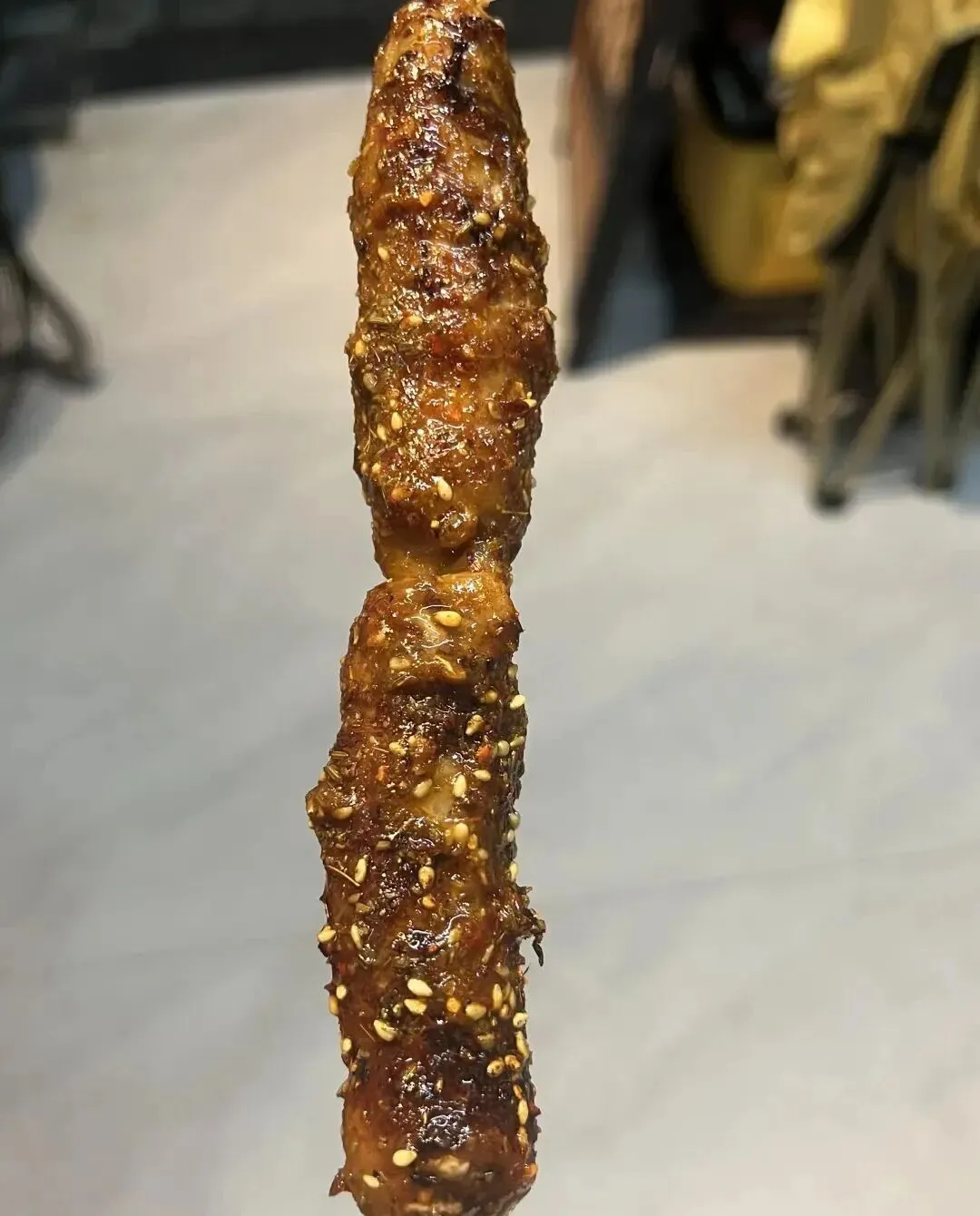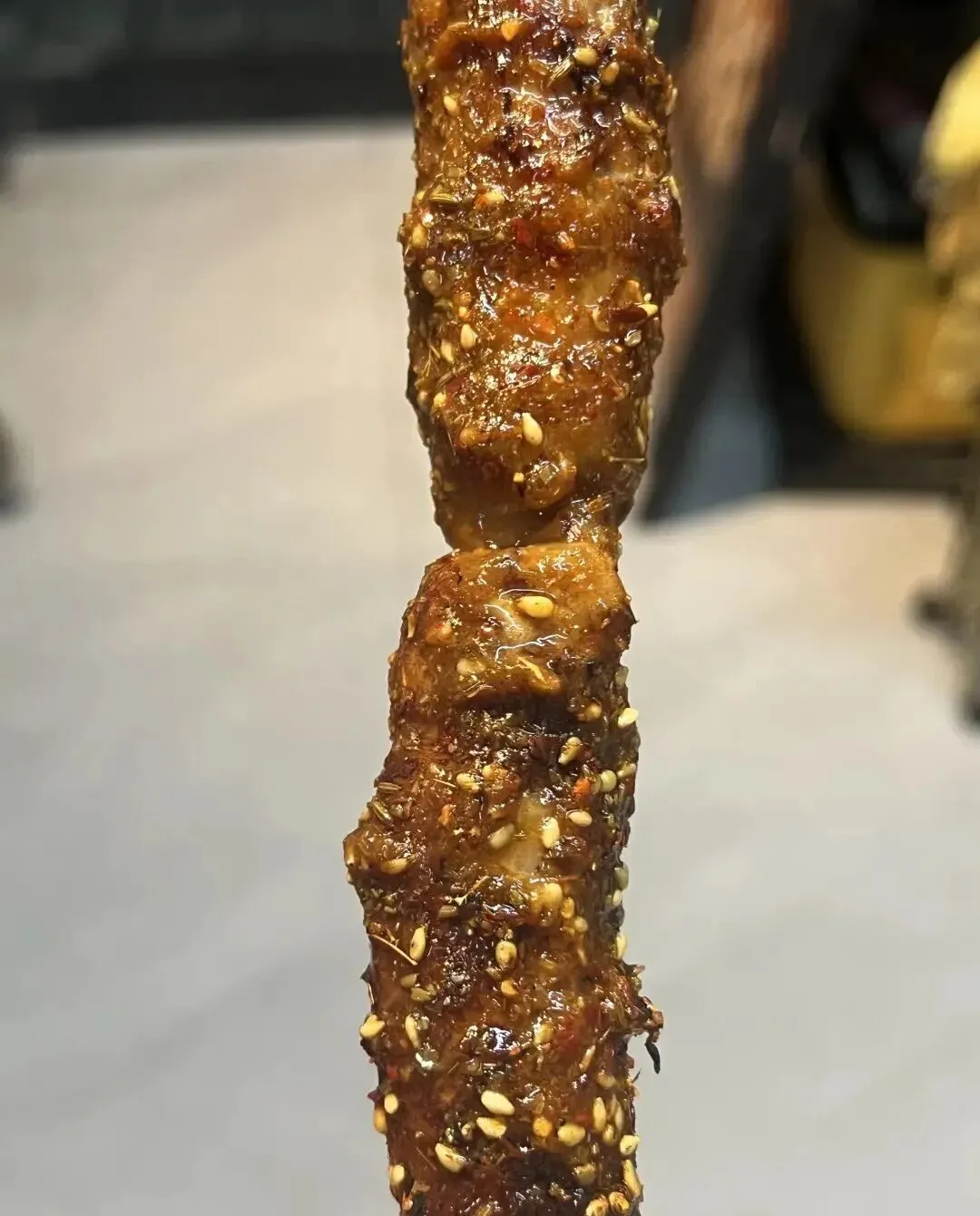 前几天在南宁街头闲逛 , 路过一家烧烤店 , 看到隔壁桌点了个东西 , 金黄金黄的 , 外面包着一层网状的皮 , 烤得滋滋冒油。