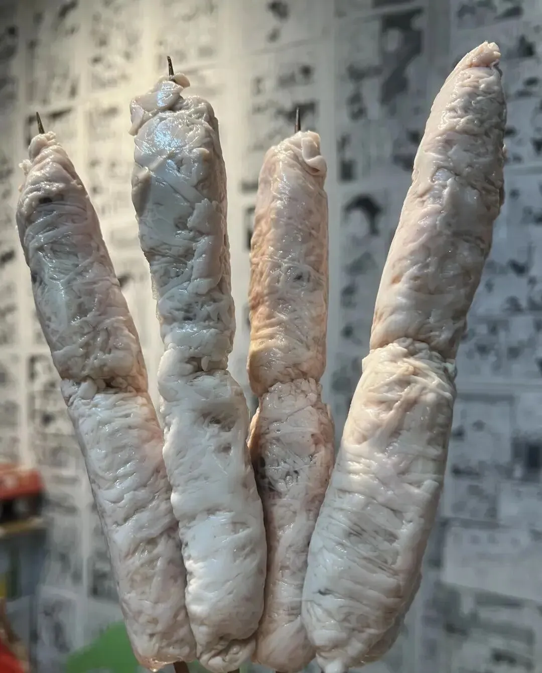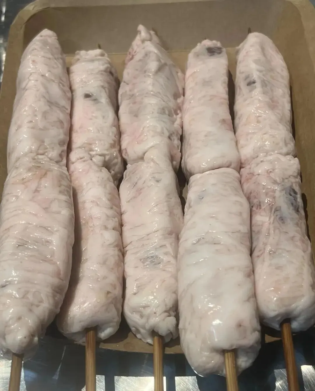 说实话 , 我是北方人 , 头一回见这玩意儿。 老板说就是用猪网油把猪肝包起来 , 放炭火上烤。
