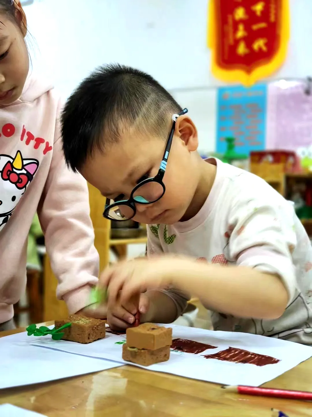 我们认为孩子观察获得大量的感性知识,老师对其加以引导,通过开放式的问答,孩子带着求知欲对其再次进行深入探索,将知识重新整合,呈现各式各样的输出方式,步入校园,您可以看到孩子们的作品形式不是成人主导千篇一律的,而是有孩子经由孩子的思考,通过不同的表现方式,呈现出与众不同的作品。