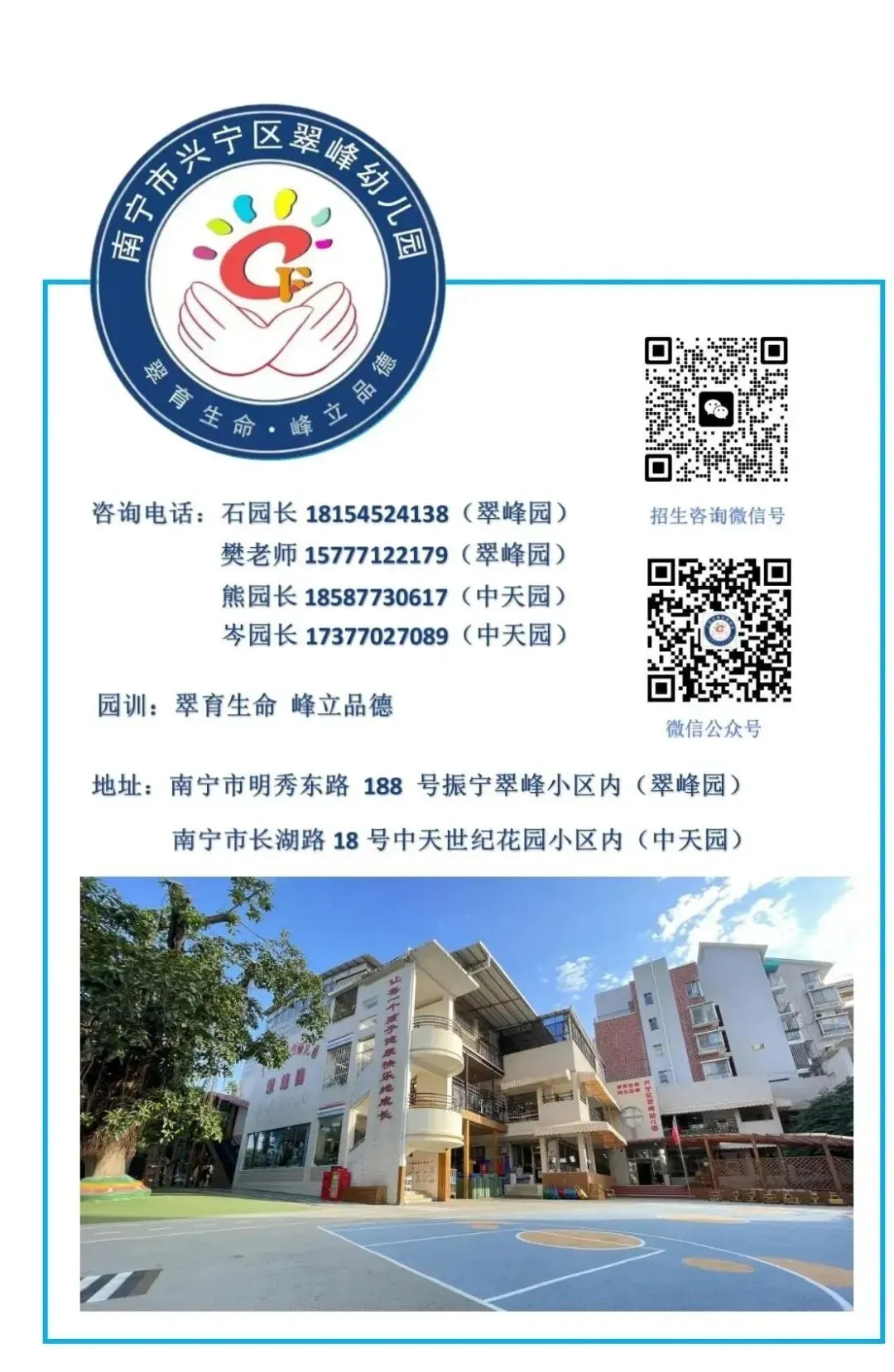 园区地址:南宁市明秀东路188号振宁翠峰小区内17栋旁(导航搜索南宁市兴宁区翠峰幼儿园)
