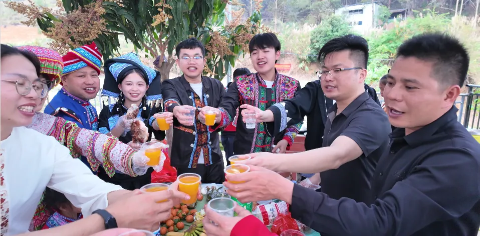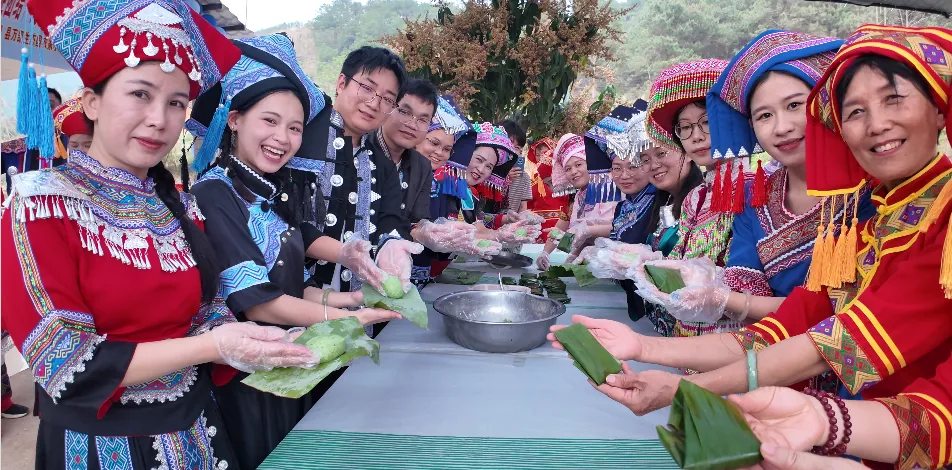民俗体验环节更是趣味横生。在“三月三青团制作”区,大家揉捏着软糯的艾草面团,将甜蜜的豆沙馅包裹其中,体验从指尖到味蕾的传统技艺,让春天的气息在唇齿间流转。而“民族长桌宴”上,五色糯米饭、鱼丸、莲花、烤猪等特色美食琳琅满目,青年们举杯共饮、笑语盈盈,舌尖上的交融恰如民族情感的凝聚。宴席间,万山红舞蹈队献上《请到我家来》,舞姿翩跹,邀约四海宾朋共赴这场文化之约。