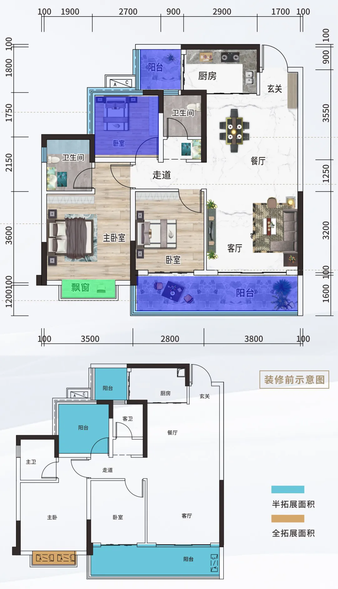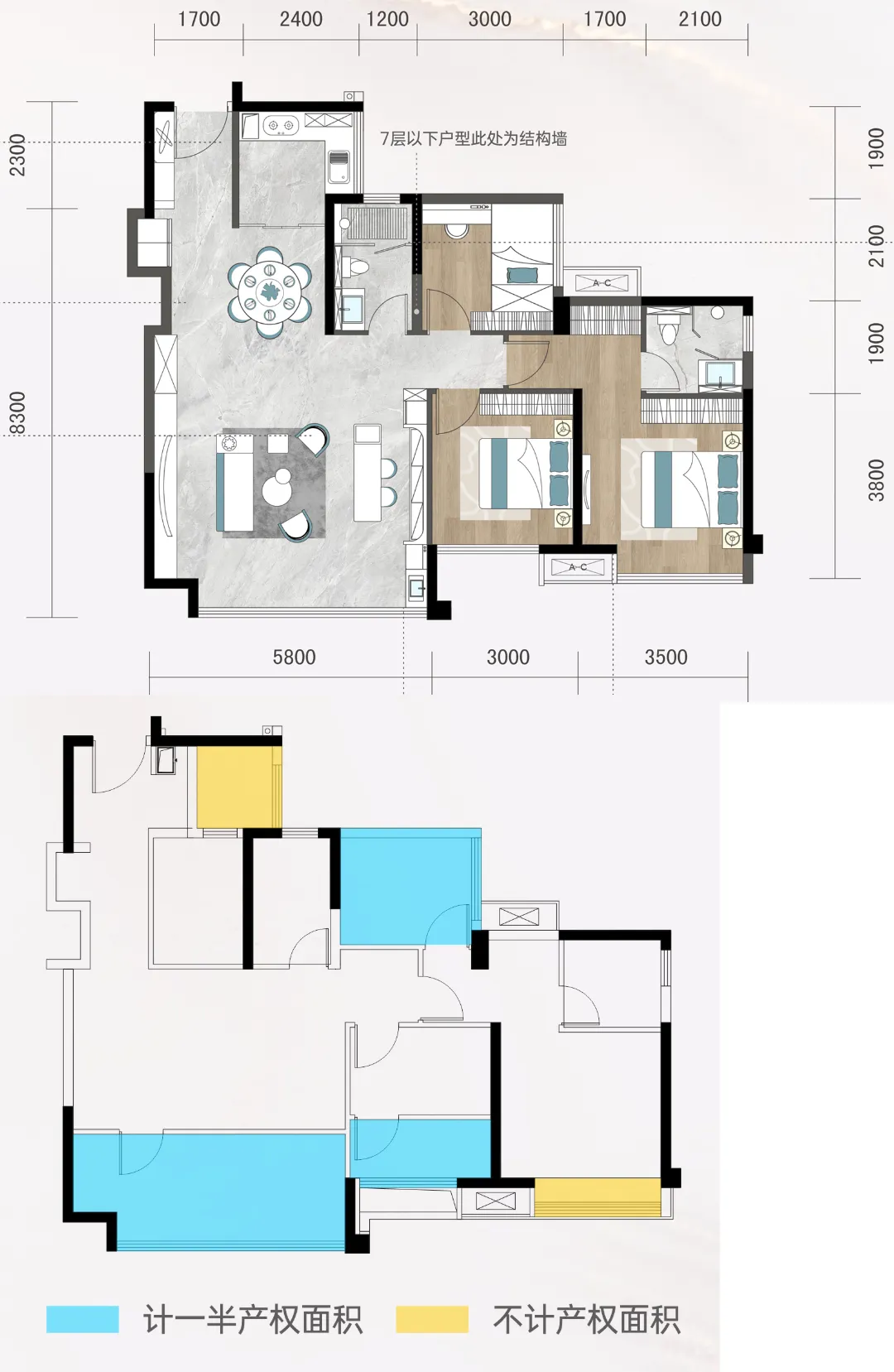 比如鱼峰某首发新规盘,只看结构图似乎只是比旧规产品多一个半赠送的阳台,装修示意图上南北阳台保留完整,看上去只是把旧规户型尺寸放大了。但这看似保守的设计也能抵消不少公摊面积,95㎡户型拓展面积约11.83㎡,面积最大的129㎡户型拓展面积约19.59㎡。