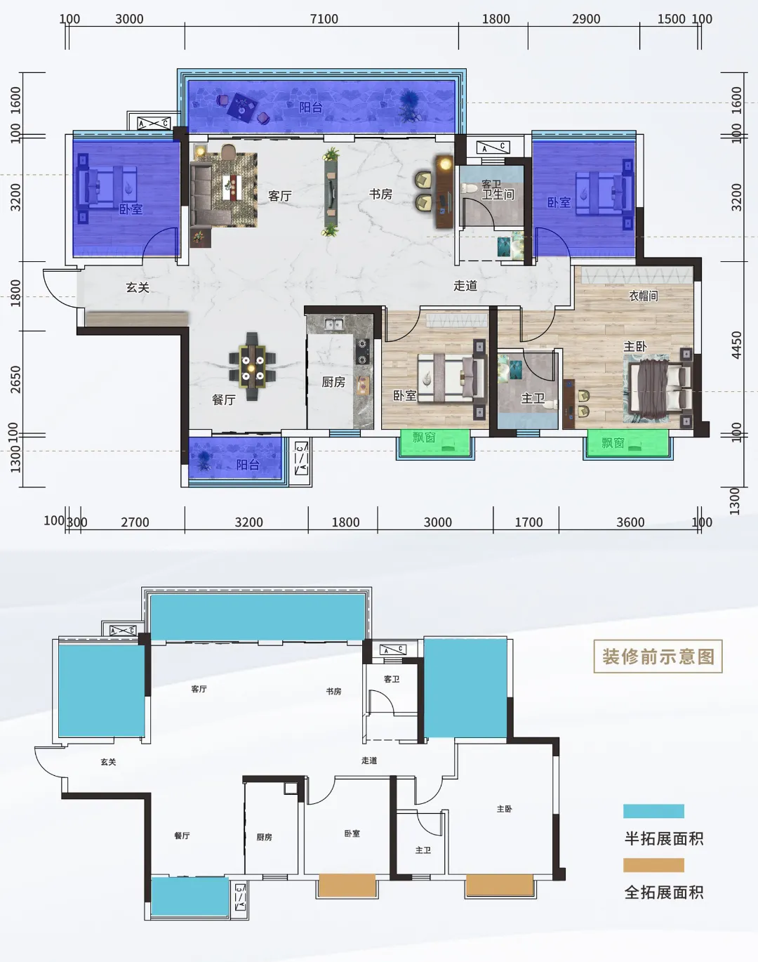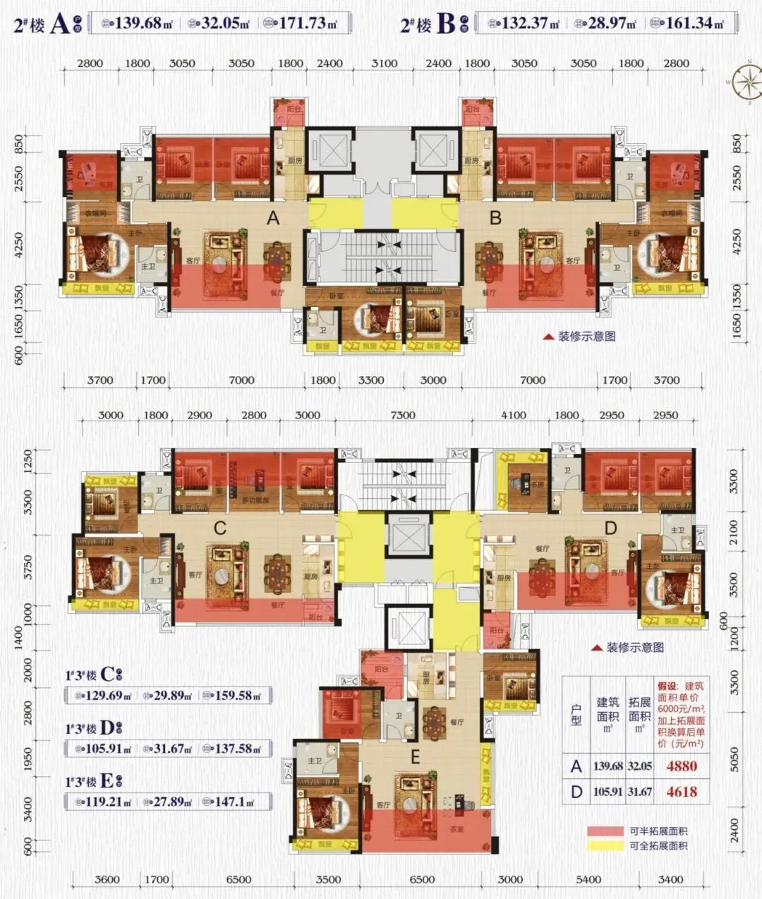 柳江某新盘把电梯厅的公共面积算到了拓展面积里,建面最小的105.91㎡户型拓展面积标称31.67㎡,建面最大的139.68㎡户型拓展面积标称32.05㎡,比很多主城区新规盘同建面的户型都要大。并且它很多户型阳台改客厅、餐厅是基本操作,阳台改成2个甚至3个房间的装修示意也是相当妙。