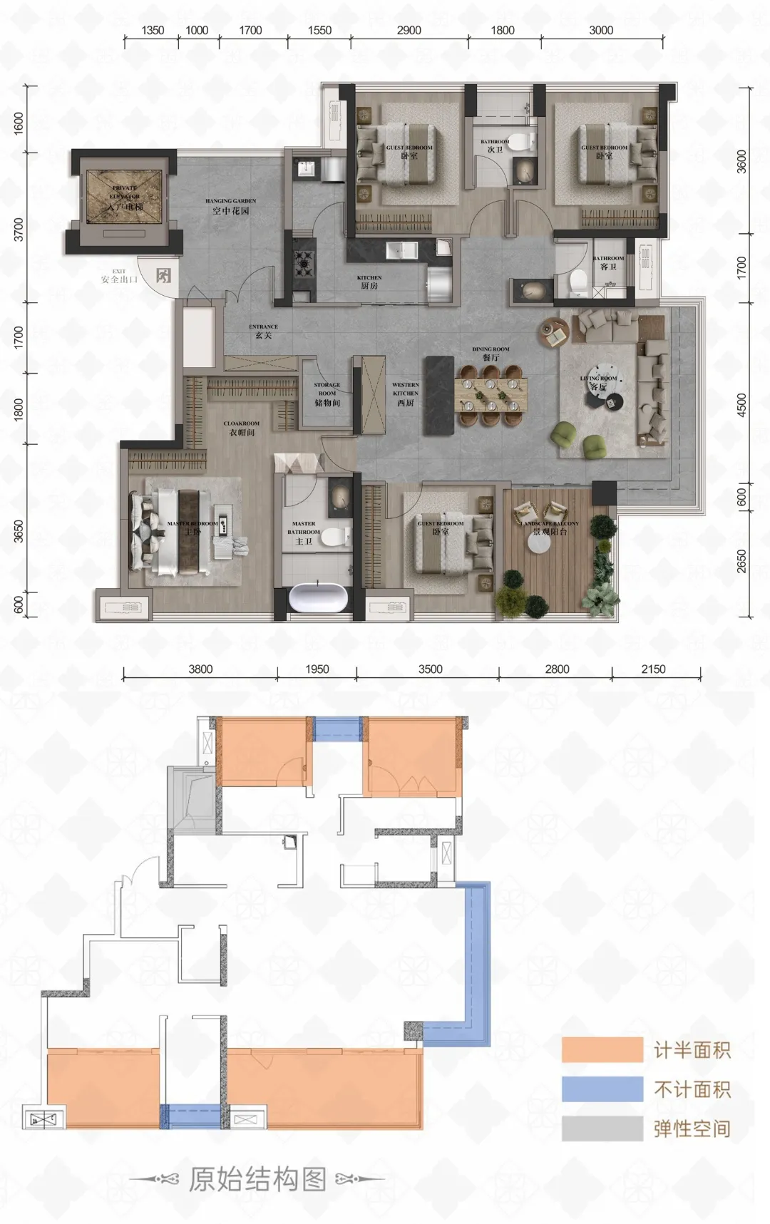 虽然该户型也是5房(4+1房),但是要达到装修示意图的效果,主卧有一段墙体需要自己砌,动区很多地方也要自己隔开,厨房与生活阳台的空间如何取舍需要研究。
