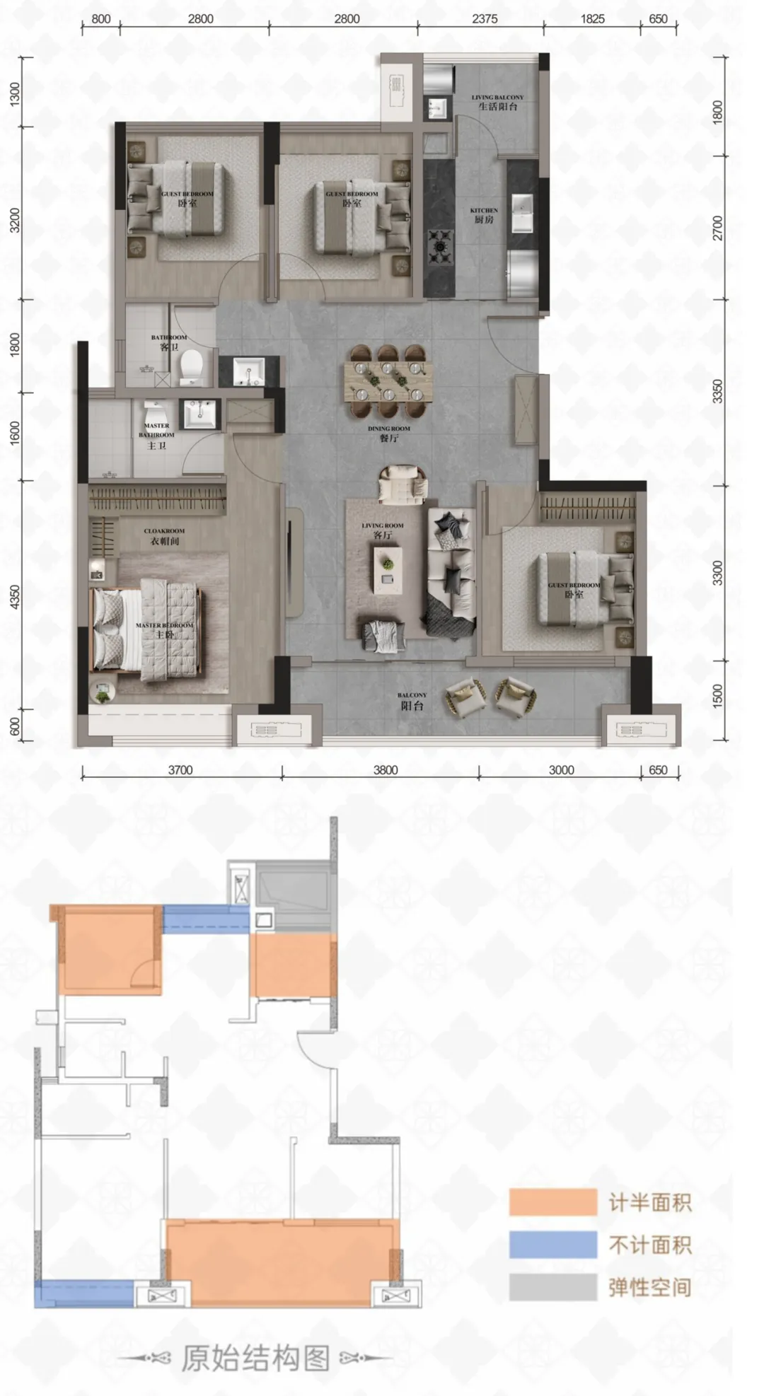 再加上主卧有不计面积的超长L型落地飘窗,基本满足时下对于大动区、强采光、强对流户型的需求。