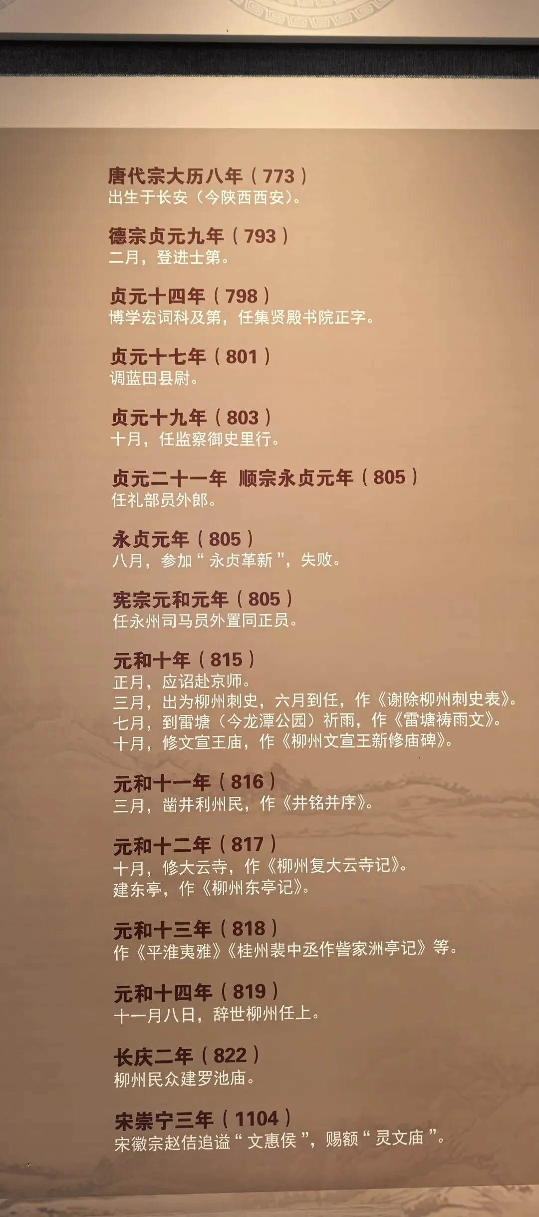 42岁回京,呆了三个月,又被贬到柳州,四年之后客死柳州。不过在柳州的职位倒有实权,类似于市长兼市委书记。所以他在这里干了好多事儿,包括废除奴婢制度、教民挖井、植树造林、兴修水利、创办学校,是深受柳州人民爱戴的老市长。