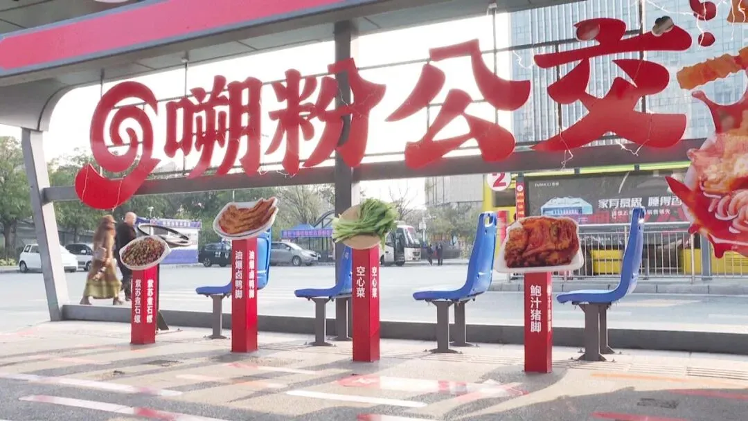 互动空间设置在人流密集交通枢纽,以实景互动为核心,为游客带来沉浸式体验。一进入空间,巨型红色“嗍粉公交”立体字牌便映入眼帘,成为标志性打卡背景。