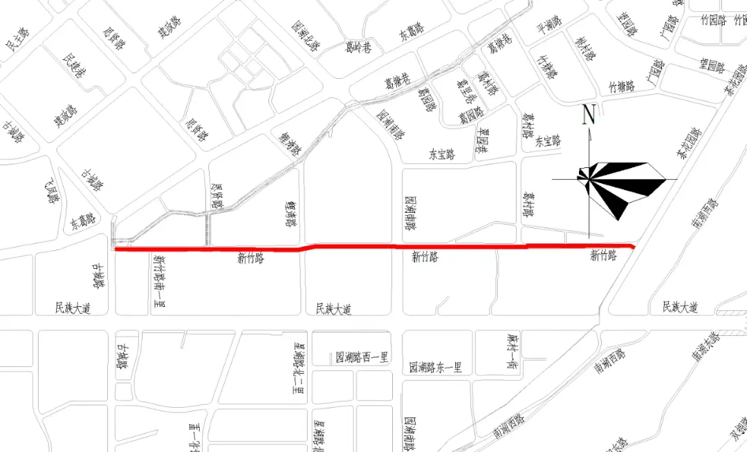 1月13日至6月30日,对新竹路(古城路—茶花园路)南侧机动车道和非机动车道进行围挡施工,保留北侧机动车道和非机动车道。施工期间,新竹路(古城路—茶花园路)实施机动车单向通行交通限制,即机动车仅可从新竹路(古城路—茶花园路)保留的北侧机动车道转出往南北东3个方向通行,禁止从其他方向转入。非机动车不受影响正常通行。新竹路(古城路—茶花园路)施工顺序为从西向东推进,每段围挡长度为150米。相关车辆可绕行民族大道、古城路、东葛路、茶花园路等道路。