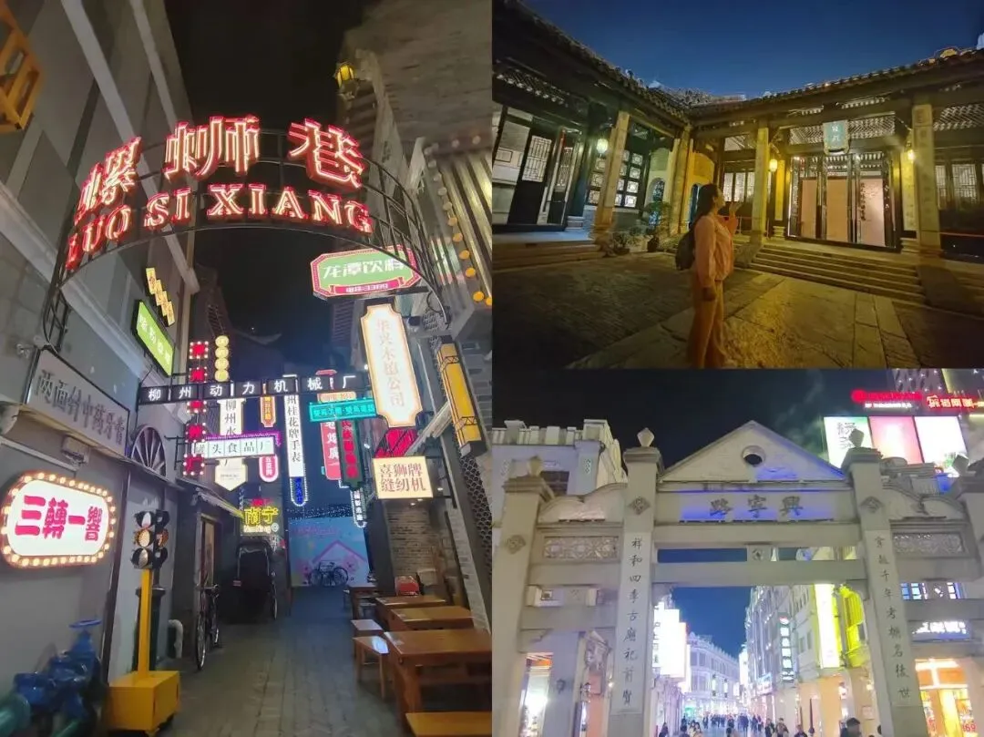 酒足饭饱后,我们租了共享电动车,沿着邕江慢慢骑行。晚风拂面,两岸灯光倒映江中,南宁的夜景在车轮前徐徐展开。最后来到三街两巷历史街区,青砖黛瓦的老建筑在夜色中更显韵味,我们在此拍下此行的第一组合影。