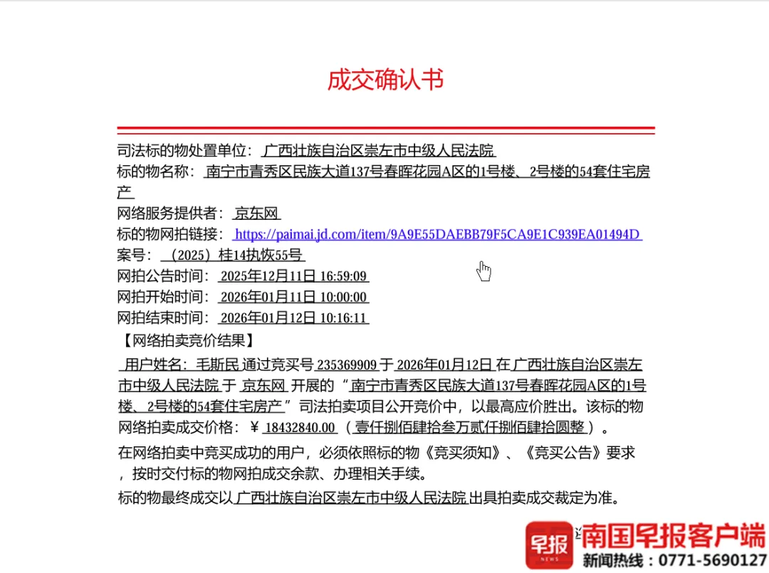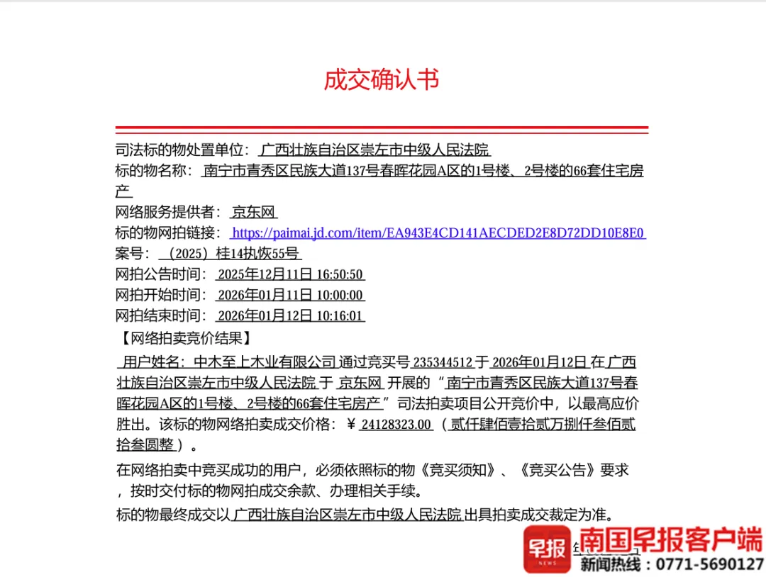1月12日,崇左市中级人民法院在京东司法拍卖平台挂出的两宗共120套住宅资产包成功落槌,买家是颇具神秘色彩的一家木业公司及一名自然人。该拍卖标的是位于南宁市青秀区繁华地段永凯春晖花园的房产,此前系由广西前糖业大亨、广西前首富赖可宾旗下地产公司所持有。
