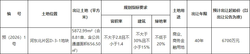 2026年柳州首宗预出让土地,位于河东北片区D-3-1地块,占地8.81亩,土地用途为商业商务金融用地,预出让价格为6700万元。